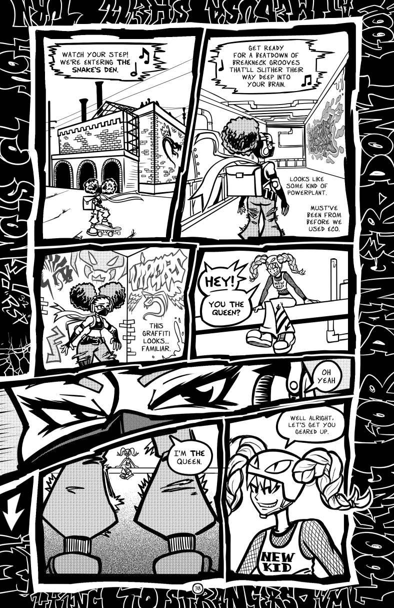 A fun artistic challenge with making "Sky Limit" is that I get to design the graffiti that different crews make. Everyone has a motif, a theme, a shape language. Panel 3 is a sketchbook page for the Flying Vipers graffiti in-universe and real life! Neat!