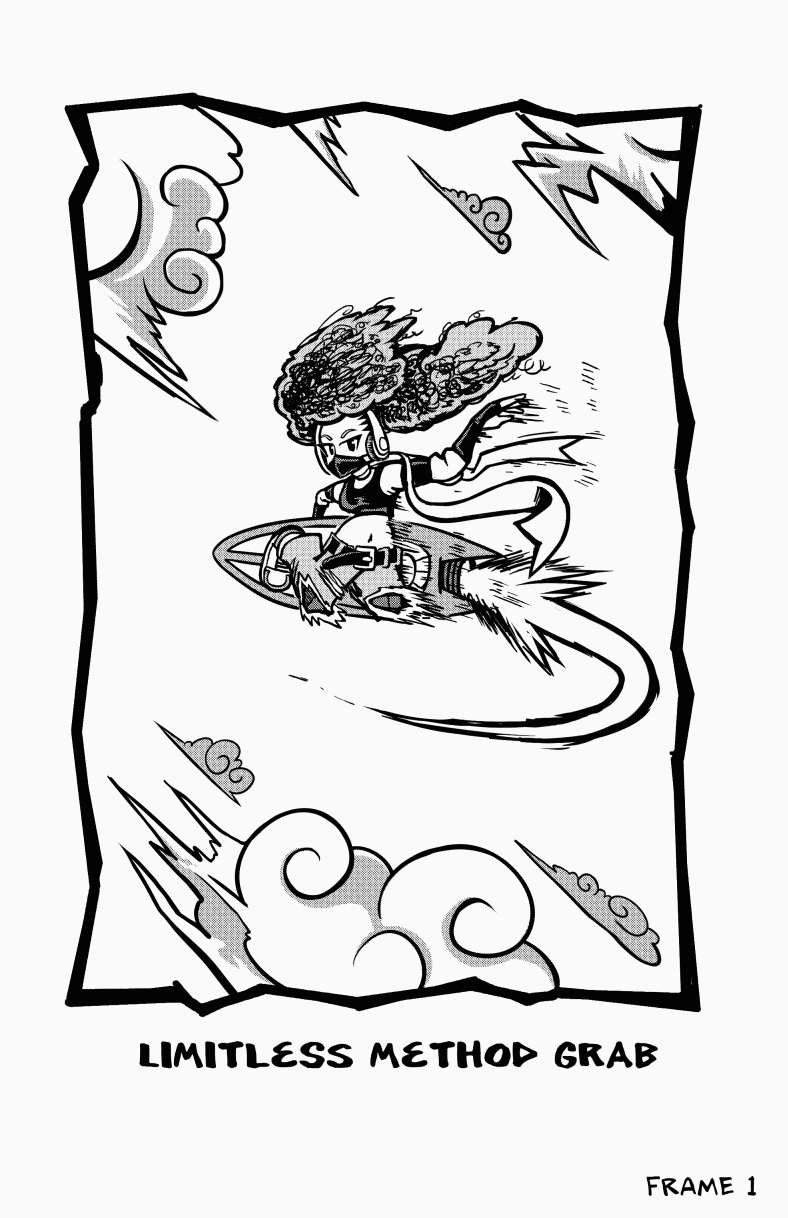 I vowed to not speak negatively of my art in these page commentaries, buuuuuut... I think the trail from the Jetboard should have broke through the panel border. Would've made the action feel 3-D. Breaks through the border. Could've been life changing. Oh well. I've already printed as-is to make first editions of Sky Limit #1 months ago. We're past the stage for changes. Not changing anything to this comic unless a publisher wants to hit me up for wider distribution.
